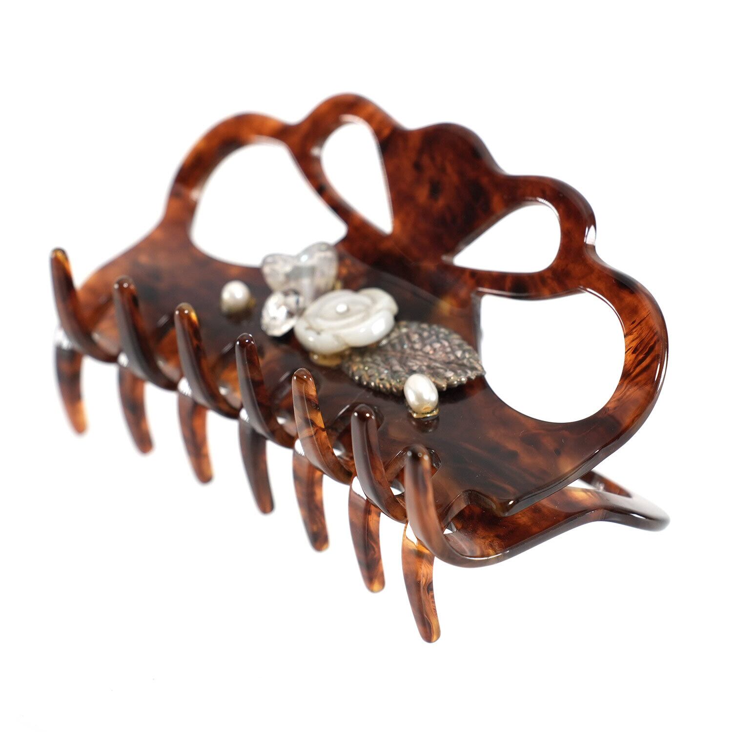 土台はイタリア製の硬質アクリル樹脂を用い、フランスの工房で仕上げました。 フランスの工房は、ヘアアクセサリーの伝統を受け継ぐ山奥の小さな町にある工房です。