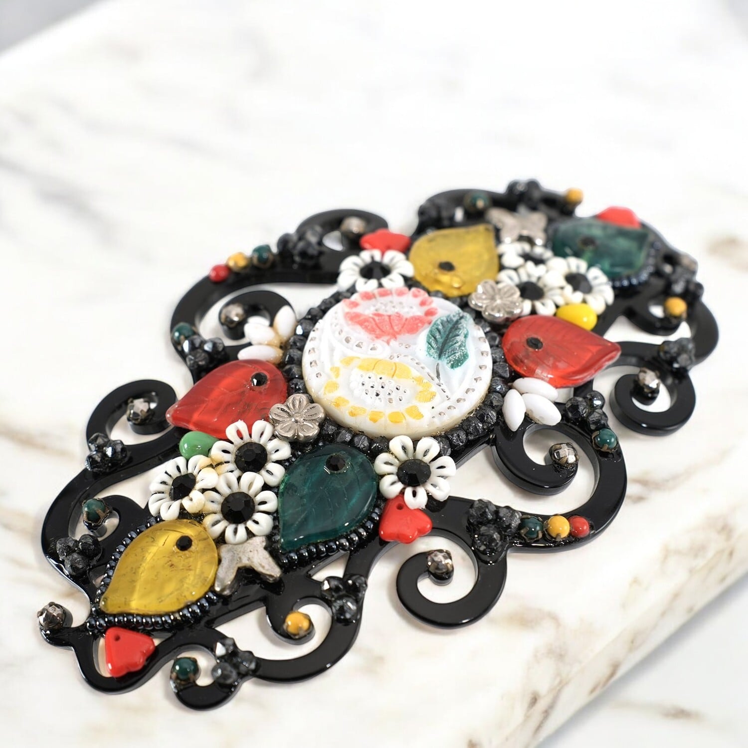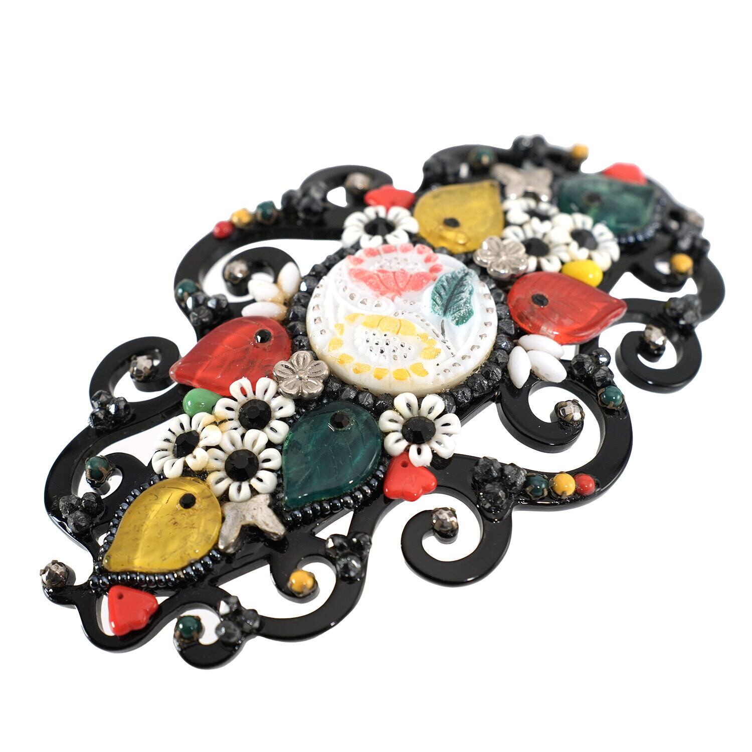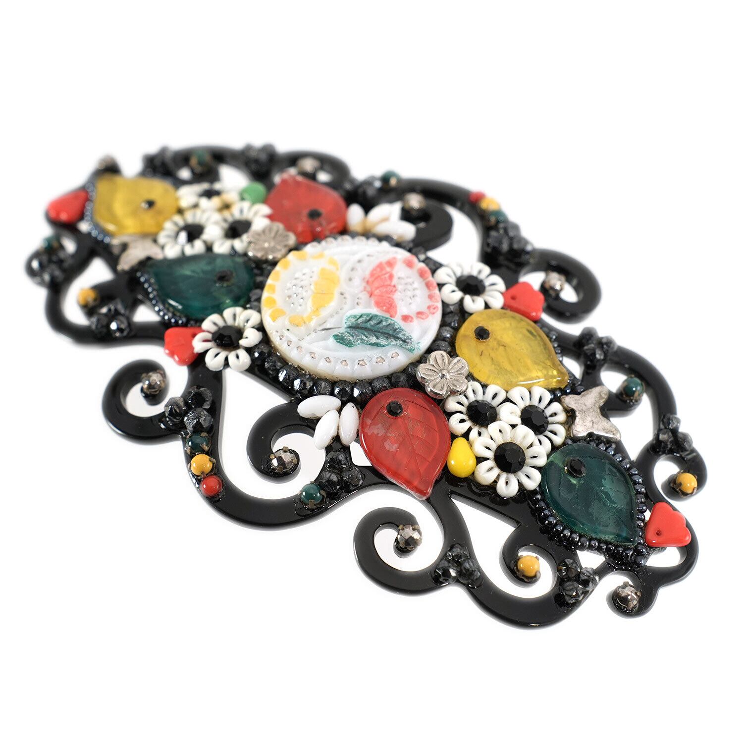 上質なボヘミアングラスをあしらい、高級感あふれるバレッタ。 花や蝶、葉モチーフを散りばめたラグジュアリーなデザインです。