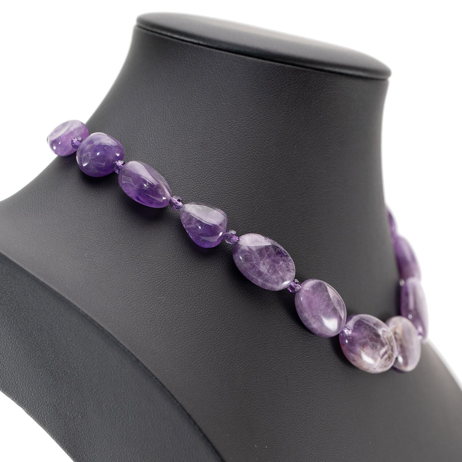 大粒のアメシストをあしらったショートネックレス。 アクセサリーの伝統を受け継ぐベテラン職人による丁寧なハンドメイドです。 上品なパープルが美しく、デコルテをエレガントに演出します。 デイリーのおめかしやドレスアップスタイルにふさわしいクオリティです。