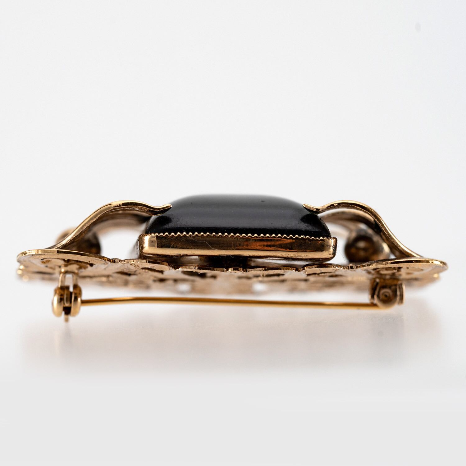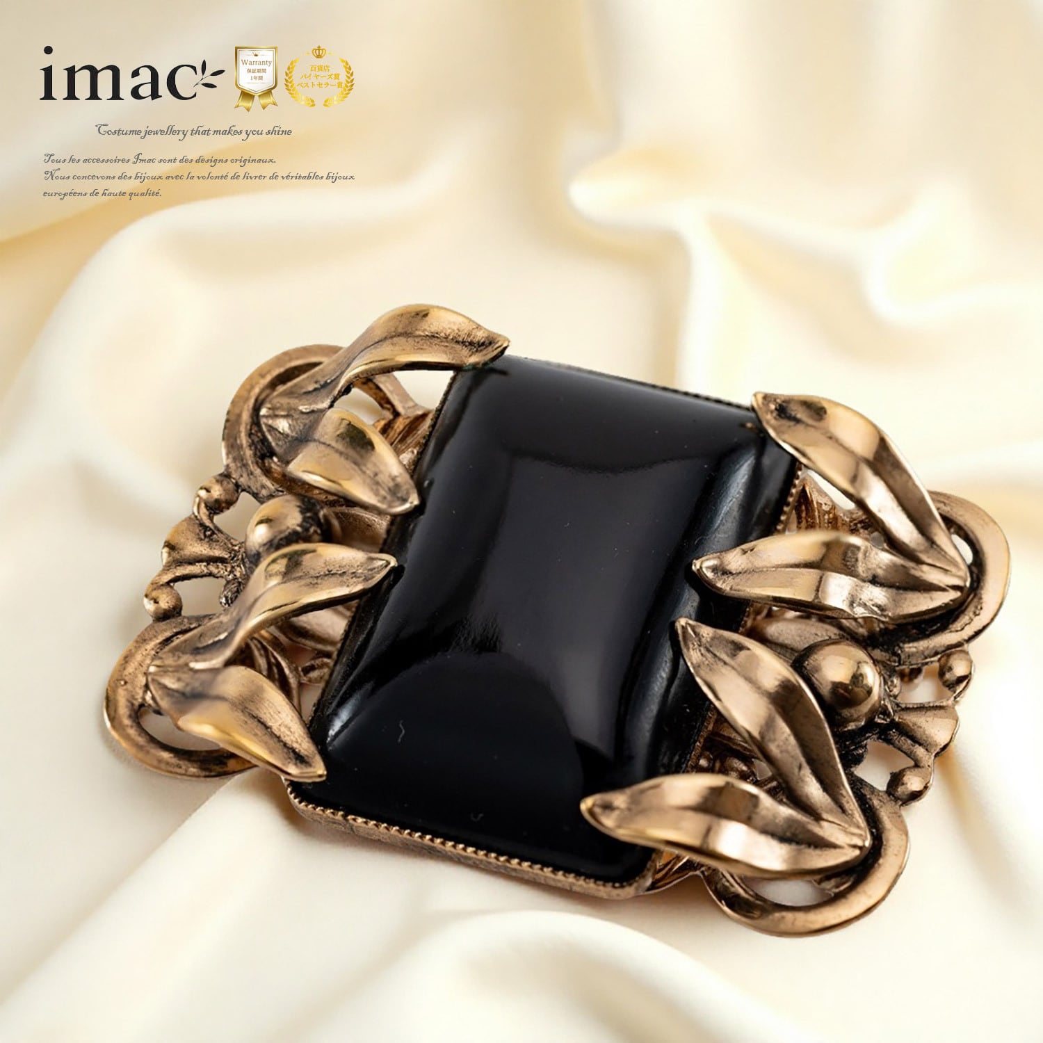 ボタニカル(植物)モチーフのアールヌーヴォー風のブローチ。 イマックデザイナーのデザイン画が忠実に再現された、美しいフォルムです。 黒のボヘミアングラスをあしらい、シックな印象です。 アクセサリーの伝統を受け継ぐヨーロッパの職人による丁寧なハンドメイド。 パーティーやデイリーのおめかしにふさわしいブローチです。 コートやジャケットの襟もとのアクセントにもおすすめです。