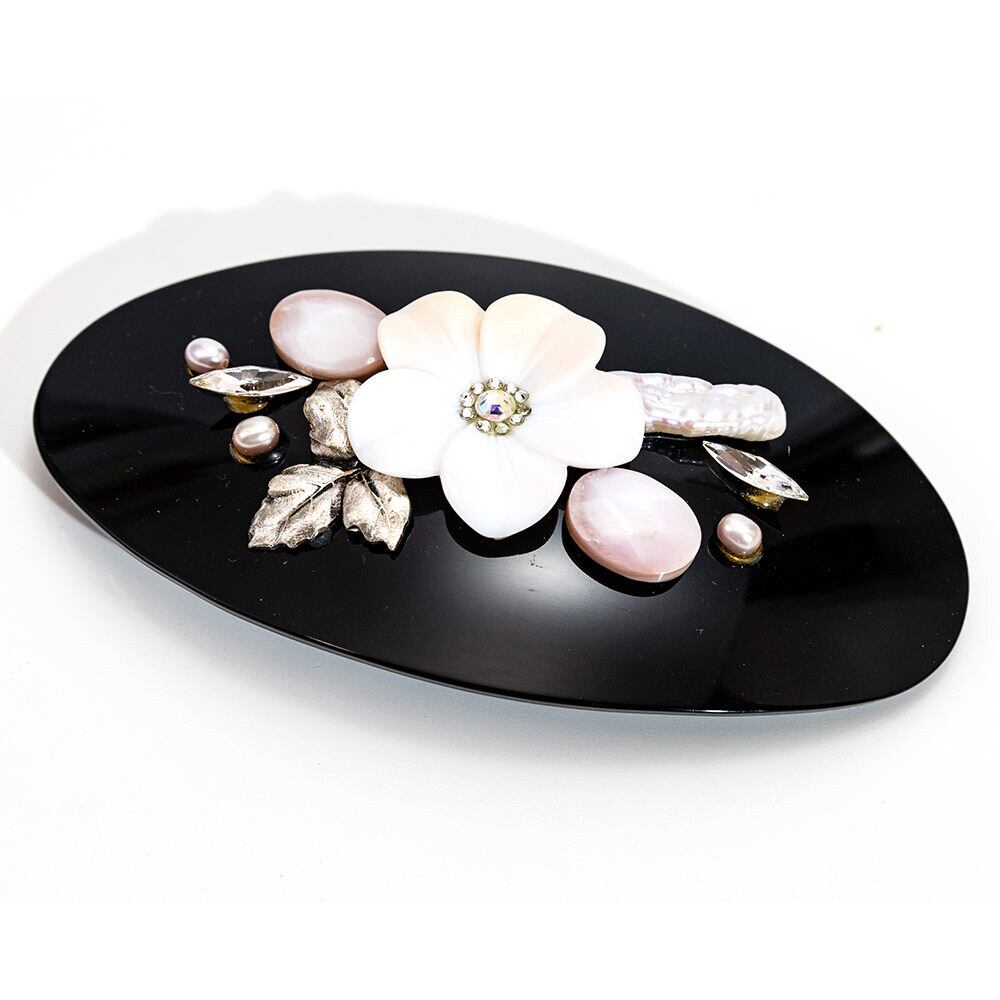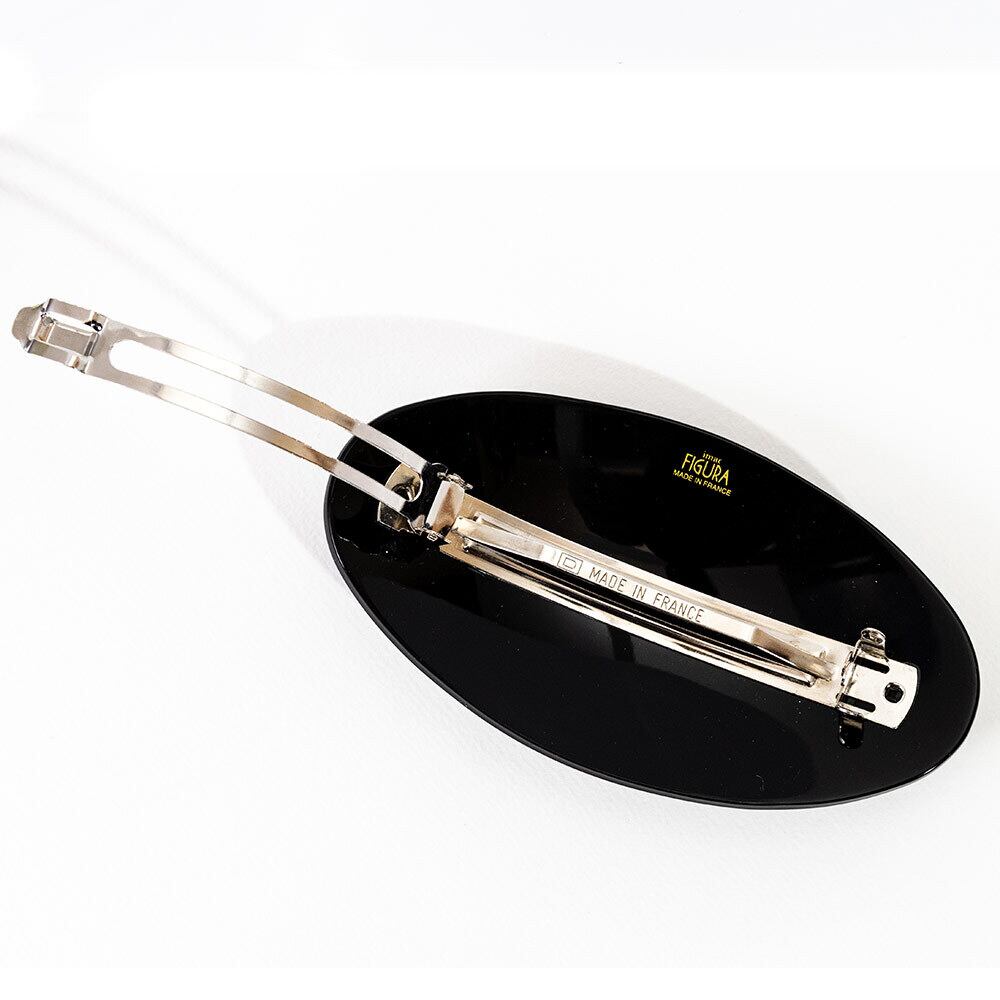 土台はイタリア製の硬質アクリル樹脂を用い、フランスの工房で仕上げました。 フランスの工房は、ヘアアクセサリーの伝統を受け継ぐ山奥の小さな町にある工房です。