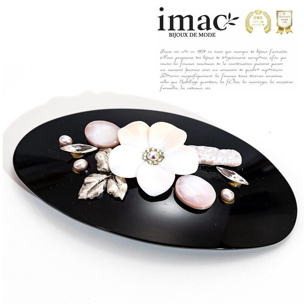 シェル、ピンク蝶貝、淡水パールの組み合わせが華やかなヘアバレッタ。 フラワーモチーフが女性らしさを演出し、蝶貝の優しい光沢が上品な印象です。 蝶貝とは真珠の母貝で「マザーオブパール」と呼ばれる上質なシェルです。 アクセサリーの伝統を受け継ぐベテラン職人による丁寧なハンドメイド。 パーティーにもデイリーのおめかしにもふさわしいクオリティです。 洋装にも和装にも合わせやすく、着けるシーンを選びません。 イマックのヘアバレッタはデザイン性と高い堅牢度を兼ね備え、長く愛用いただけると好評のシリーズです。