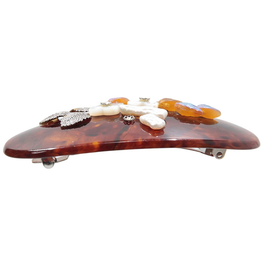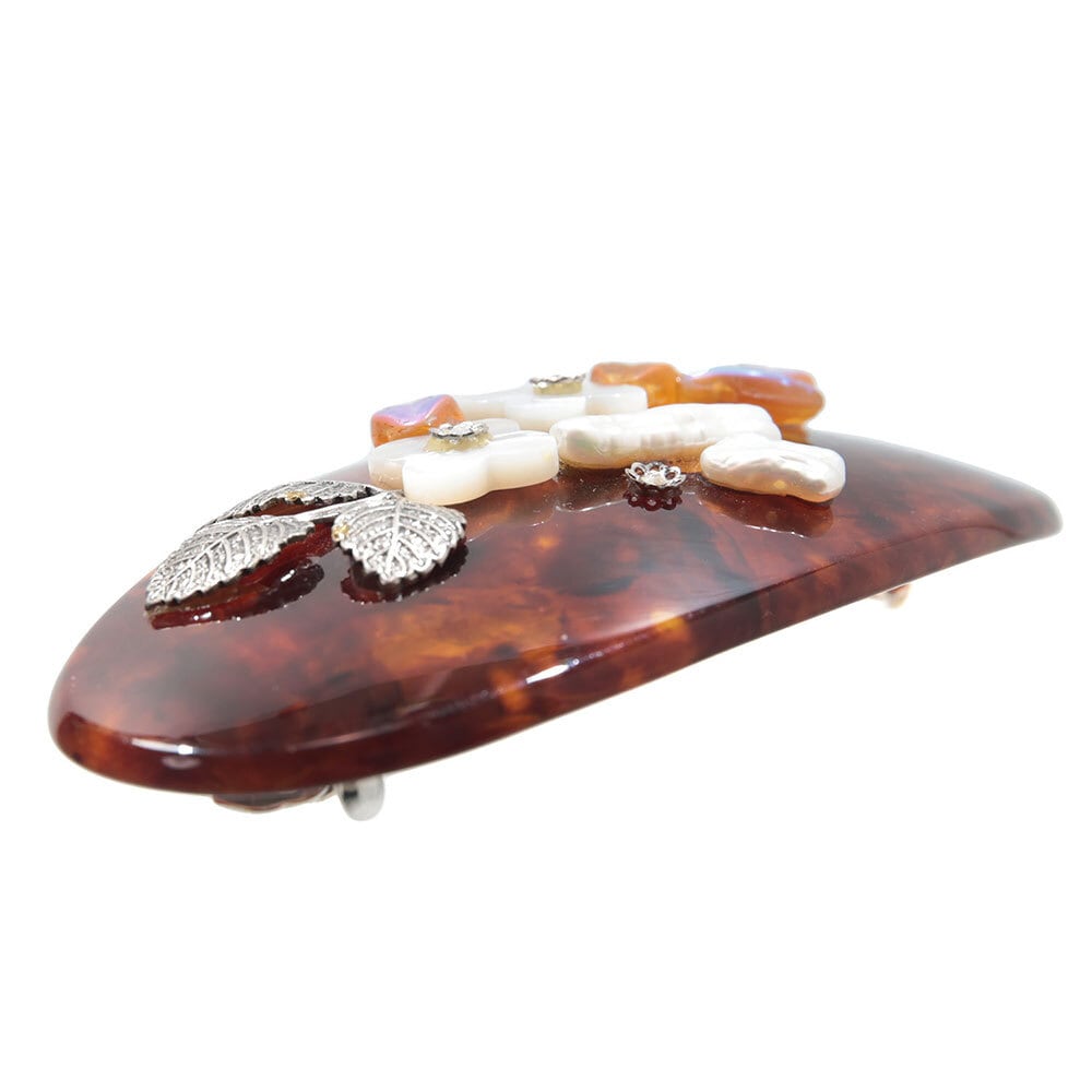 白蝶貝、上質なボヘミアングラス、淡水パールを贅沢にあしらった、ラグジュアリーなデザインのバレッタ。 上品で美しいフラワーモチーフが立体的にデザインされており、華やかで高級感あふれる印象を与えます。