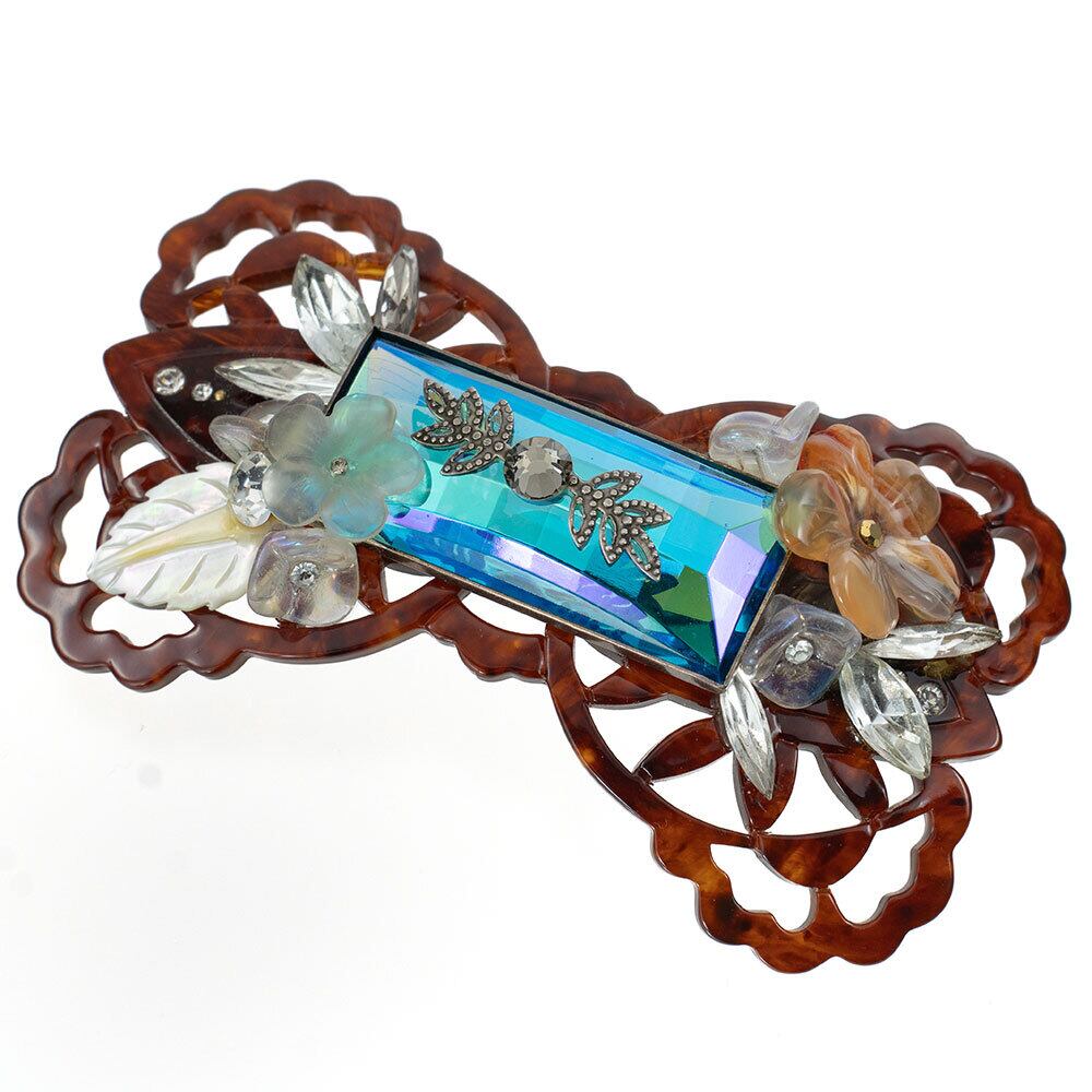 バレッタ ボヘミアングラス 天然石 カーネリアン 白蝶貝 クォーツ ラインストーン ブルー クリアカラー ブラウン フラワー 留金8cm 142497