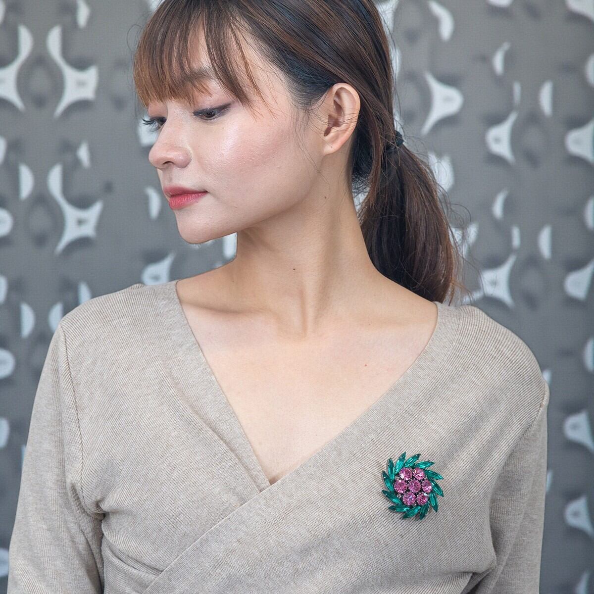 大粒のラインストーンがきらめくビジューブローチ。 イマックデザイナーのデザイン画が忠実に再現された、美しいフォルムです。 立体的なデザインで、ラグジュアリーな女性らしさを演出します。 アクセサリーの伝統を受け継ぐチェコの職人による丁寧なハンドメイド。 コートやジャケットの襟もとのアクセントにもおすすめです。