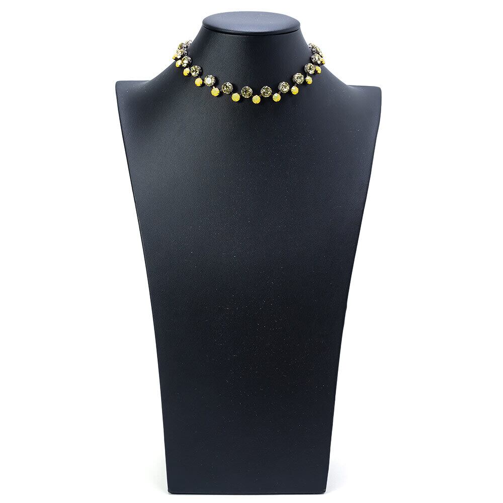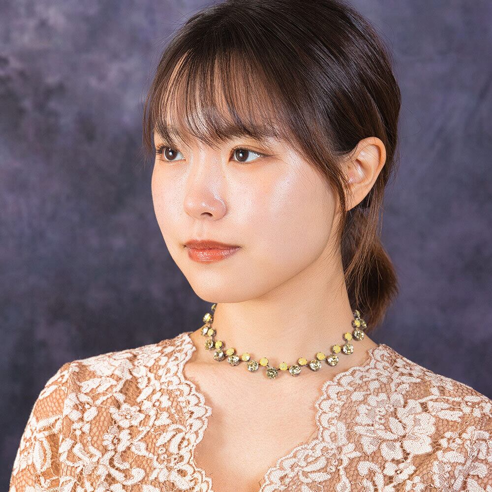 大粒のラインストーンがきらめくショートネックレス。 アクセサリーの伝統を受け継ぐヨーロッパの職人による丁寧なハンドメイドです。 異なるトーンのイエローの組み合わせが、首元をスタイリッシュに演出します。 パーティーやデイリーのおめかしスタイルにふさわしいクオリティです。