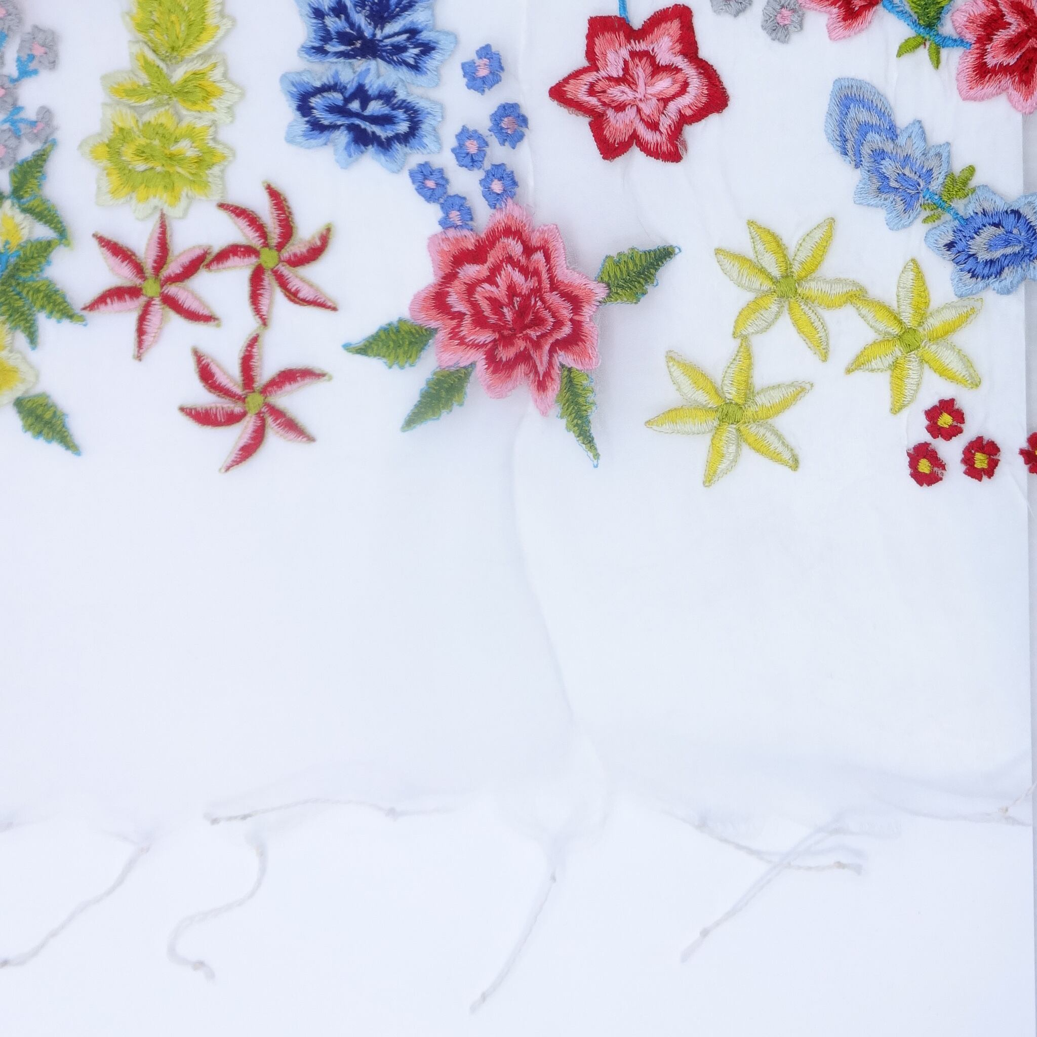 ホワイトのシルク地にフラワーの刺繍をあしらったロングスカーフ。