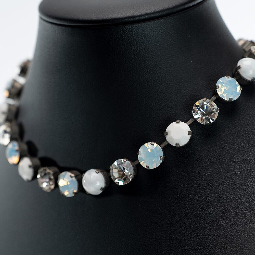 ラインストーンの煌めきが美しいネックレス。 大粒のクリアカラーとホワイトのスワロフスキークリスタル、そしてカボションカットのハンドメイドグラスを贅沢にあしらいました。 アクセサリーの伝統を受け継ぐオーストリアの職人による丁寧なハンドメイド。 デコルテを上品に演出します。 パーティーや晴れの日にふさわしいクオリティです。